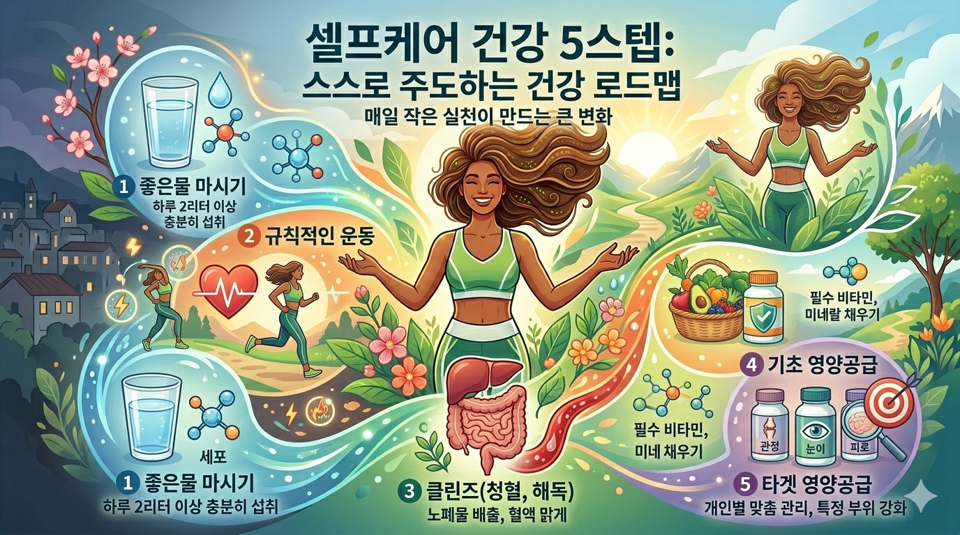 **"아프기 전에 내 몸을 스스로 지킨다"**는 셀프메디케이션의 철학은 이제 선택이 아닌 필수의 생존 전략이 되었습니다. 오늘 저는 수많은 건강법 중에서도 가장 체계적이고 실천 가능한, 우리 몸의 근본적인 균형을 되찾아주는 **'셀프케어를 위한 건강 5스텝'**을 핵심만 간략하게 요약해 드리려 합니다.