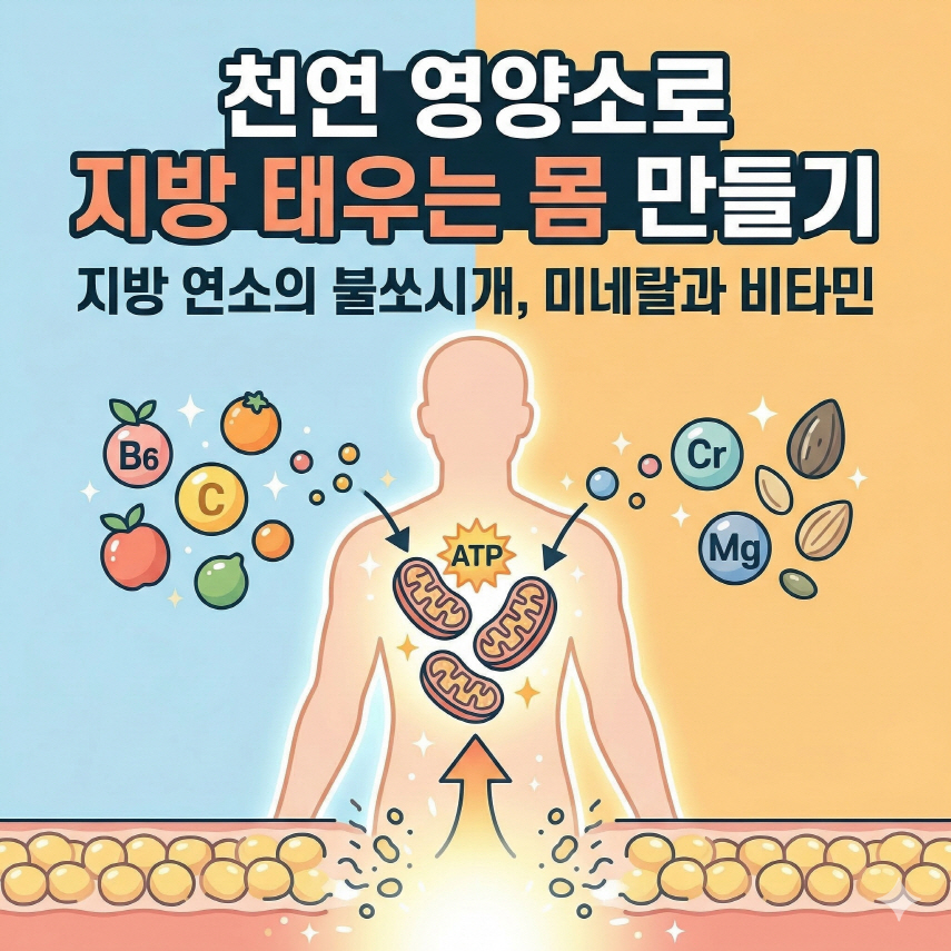 비타민은 탄수화물, 단백질, 지방을 에너지로 전환하는 대사 과정에 필수적인 '조효소' 역할을 합니다. 특히 비타민 B군은 에너지 대사에 직접적으로 관여하여 지방 태우기를 돕습니다. 비타민 C는 강력한 항산화 작용으로 체내 염증을 줄여주고, 지방 대사에 관여하는 카르니틴 합성을 돕습니다.