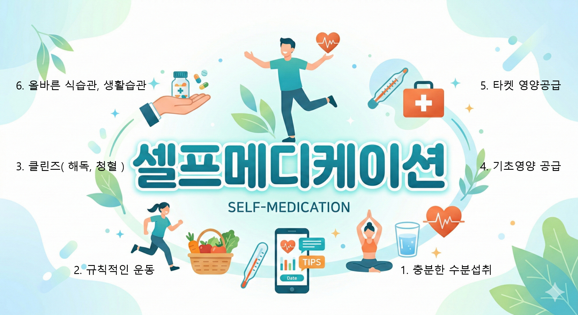 하지만 셀프메디케이션은 질병이 발생하기 전에 미리 내 몸의 상태를 점검하고, 부족한 영양을 채우며, 면역력을 끌어올리는 '예방' 중심의 주도적인 건강 관리를 뜻합니다. 병원에 내 몸을 온전히 맡기기 전에, 일상생활 속에서 나 스스로 훌륭한 주치의가 되는 것입니다.