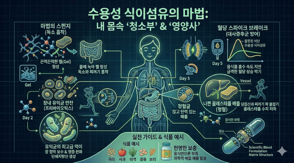 오늘 우리가 주목해야 할 것은 바로 이 **'마법의 스펀지, 수용성 식이섬유'**입니다. 이 성분이 왜 무너진 세포 환경을 복구하는 핵심 열쇠일까요?